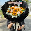 - Hoa hướng dương với sắc vàng tươi sáng là điểm nhấn chính, mang đến vẻ đẹp rực rỡ và đầy sức sống cho bó hoa.